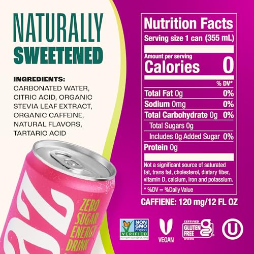 • Low Calorie Energy Drink: Whether it’s before or after your workout or keeping up with the kids, power up with a can of Zevia Energy packed with 120 mg of organic caffeine