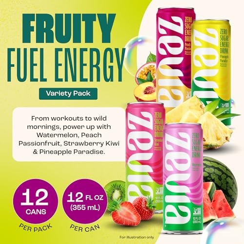 Zevia Zero Sugar Energy Drink, Fruity Fuel Variety Pack, 12 oz Cans (12-Pack) – Naturally Sweetened, Non-GMO Project Verified, Gluten-Free, Vegan